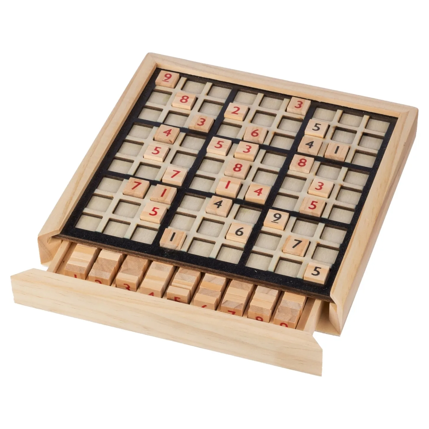 Sudoku-Spiel aus Holz. Enthält 99 nummerierte Holzspäne und einen manuellen Einschub, Spielanweisungen und Lösungen. Einzeln verpackt in einem braunen Karton.