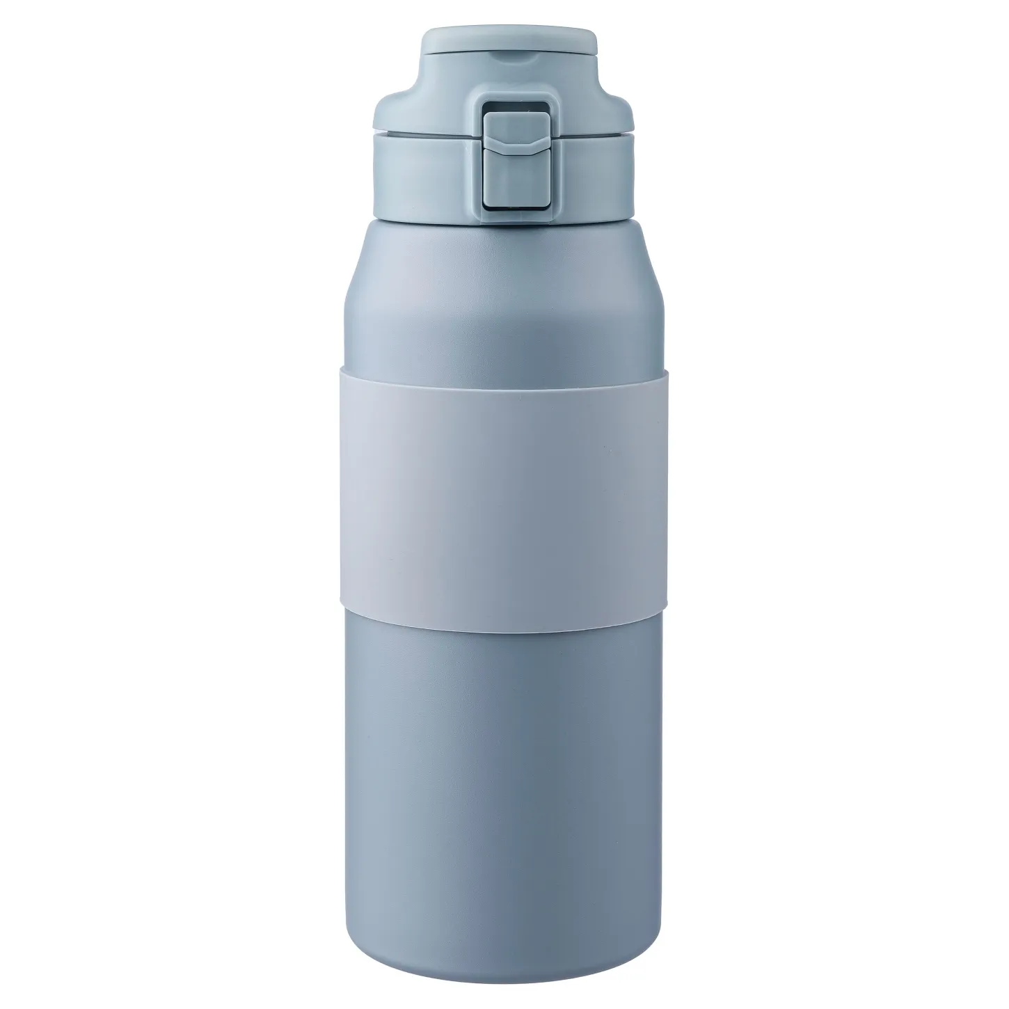 Doppelwandige Edelstahl-Trinkflasche (800 ml) mit Silikongriff, Strohhalm, PP-Deckel und Tragegriff. Hergestellt aus rostfreiem Edelstahl 304. Druckknopf zum Öffnen und Schließen des Ausgusses. Hält den Inhalt 8 Stunden lang heiß und 12 Stunden lang kalt. Einzeln verpackt in einer braunen Pappschachtel.