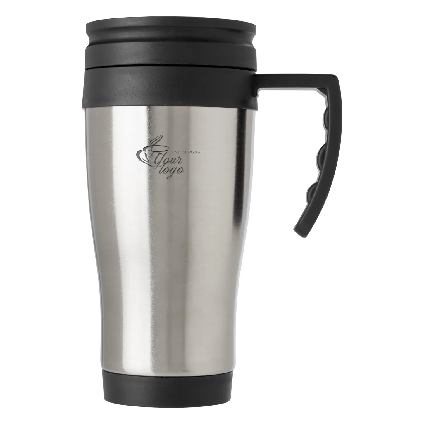 Isolierbecher aus Edelstahl, mit Kunststoffgriff, Kunststoffdeckel und verschließbarem Mundstück, Inhalt ca. 420 ml.