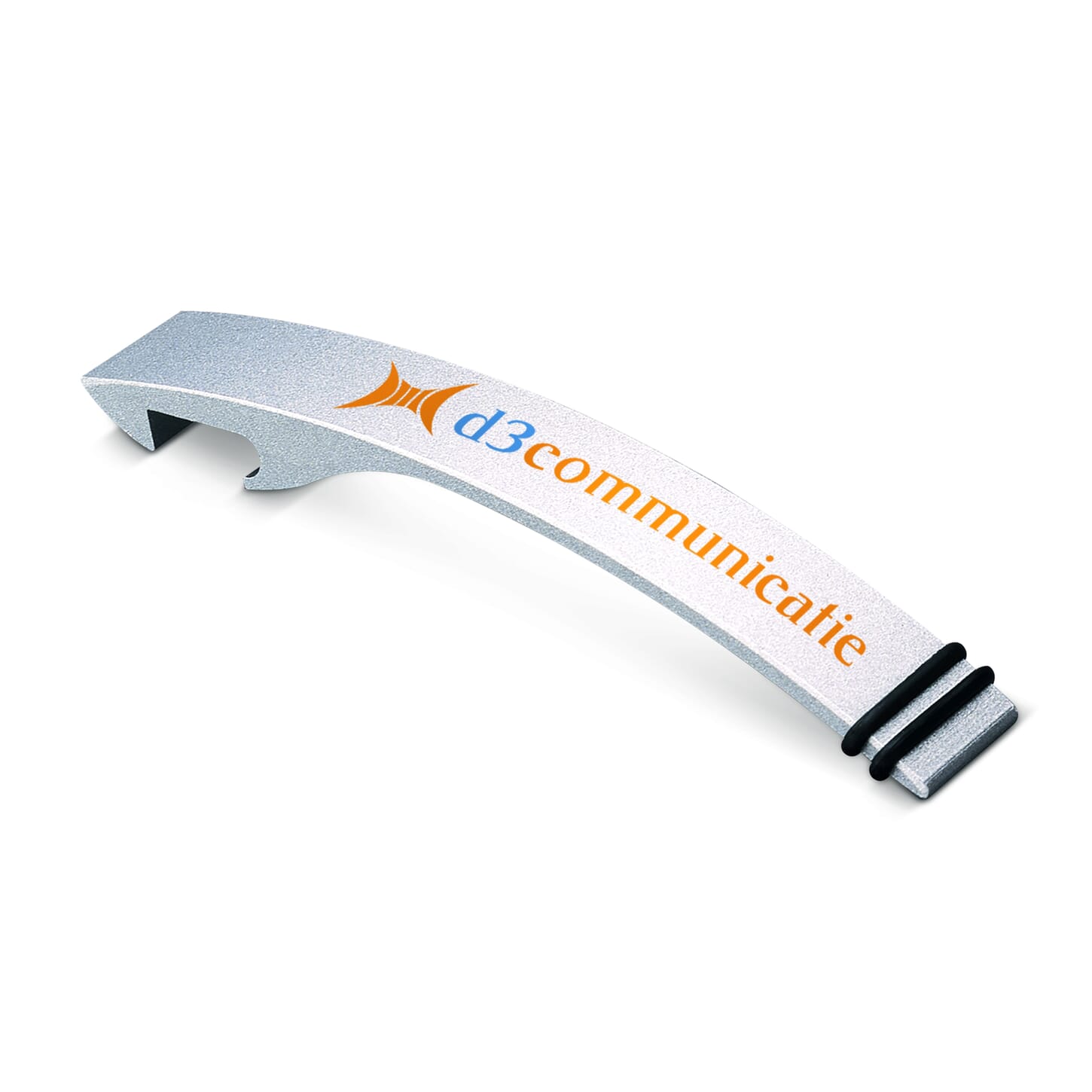 Aluminium Flaschenöffner in eleganter Form mit 2 Gummiringen.