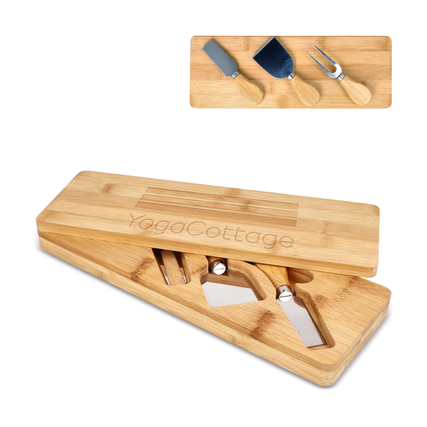 Dieses Käsemesserset wird in einer Bambusbox geliefert, die gleichzeitig als Servierbrett dient. Das Set besteht aus drei Messern, die für verschiedene Käsesorten geeignet sind und eine praktische Handhabung mit einer eleganten Präsentation verbinden.