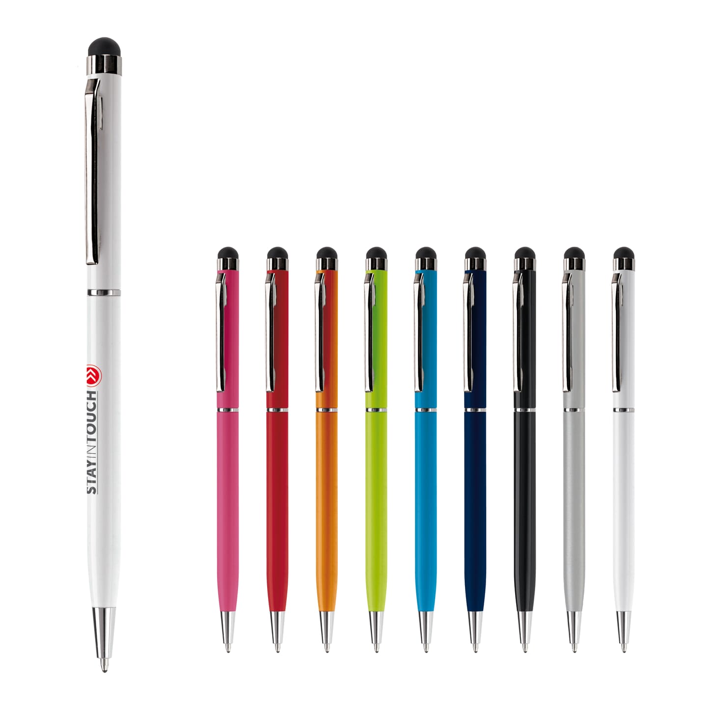 Moderner Aluminium Drehkugelschreiber mit Stylus. Blauschreibend. Ideal für Smartphones und Tablets.