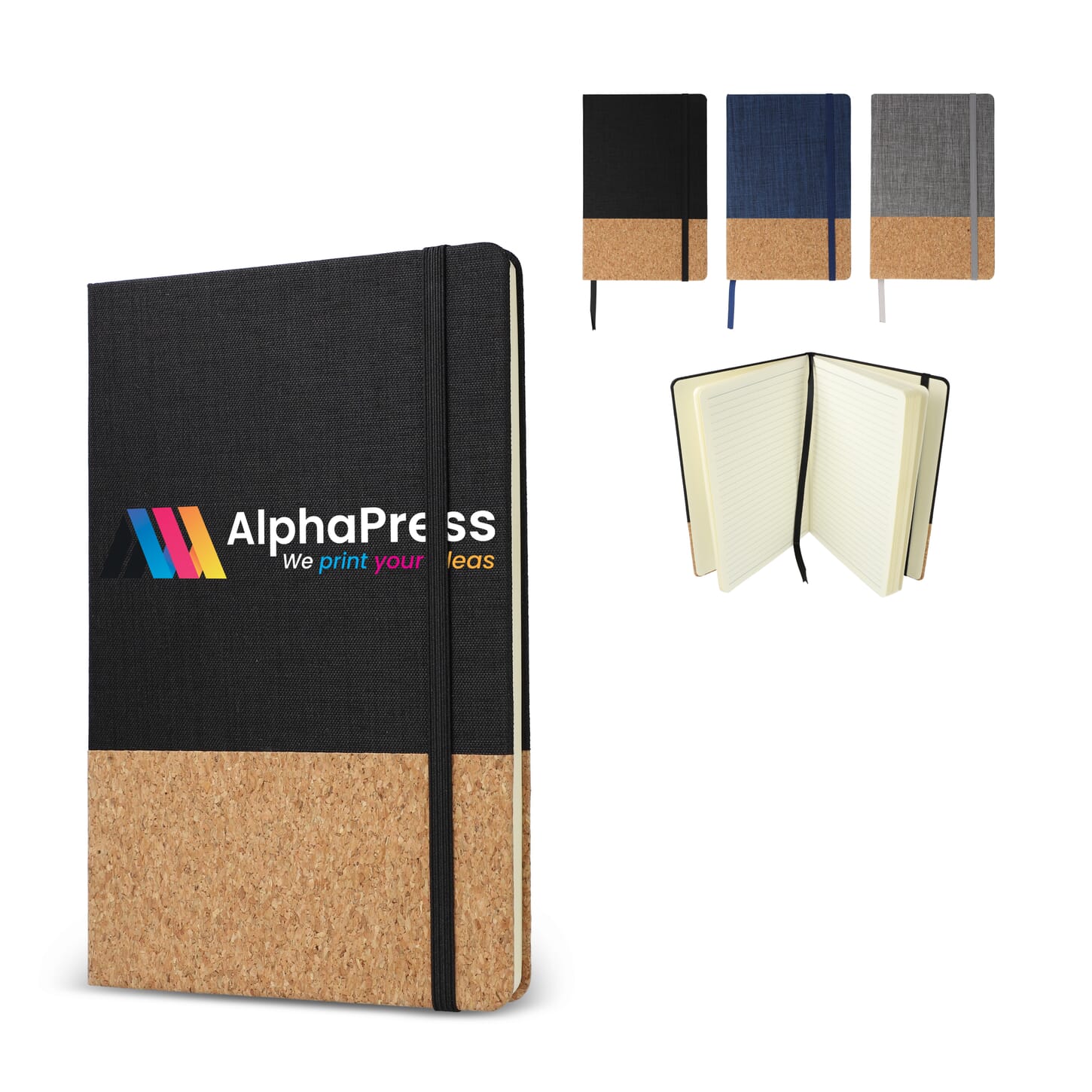 Dieses Notizbuch hat einen Einband aus recyceltem PET und Kork mit 80 linierten 70-Gramm-Blättern aus FSC-zertifiziertem Papier. Es verfügt über einen Gummibandverschluss und ein Lesezeichen-Band für zusätzlichen Komfort. Hergestellt aus R-PET