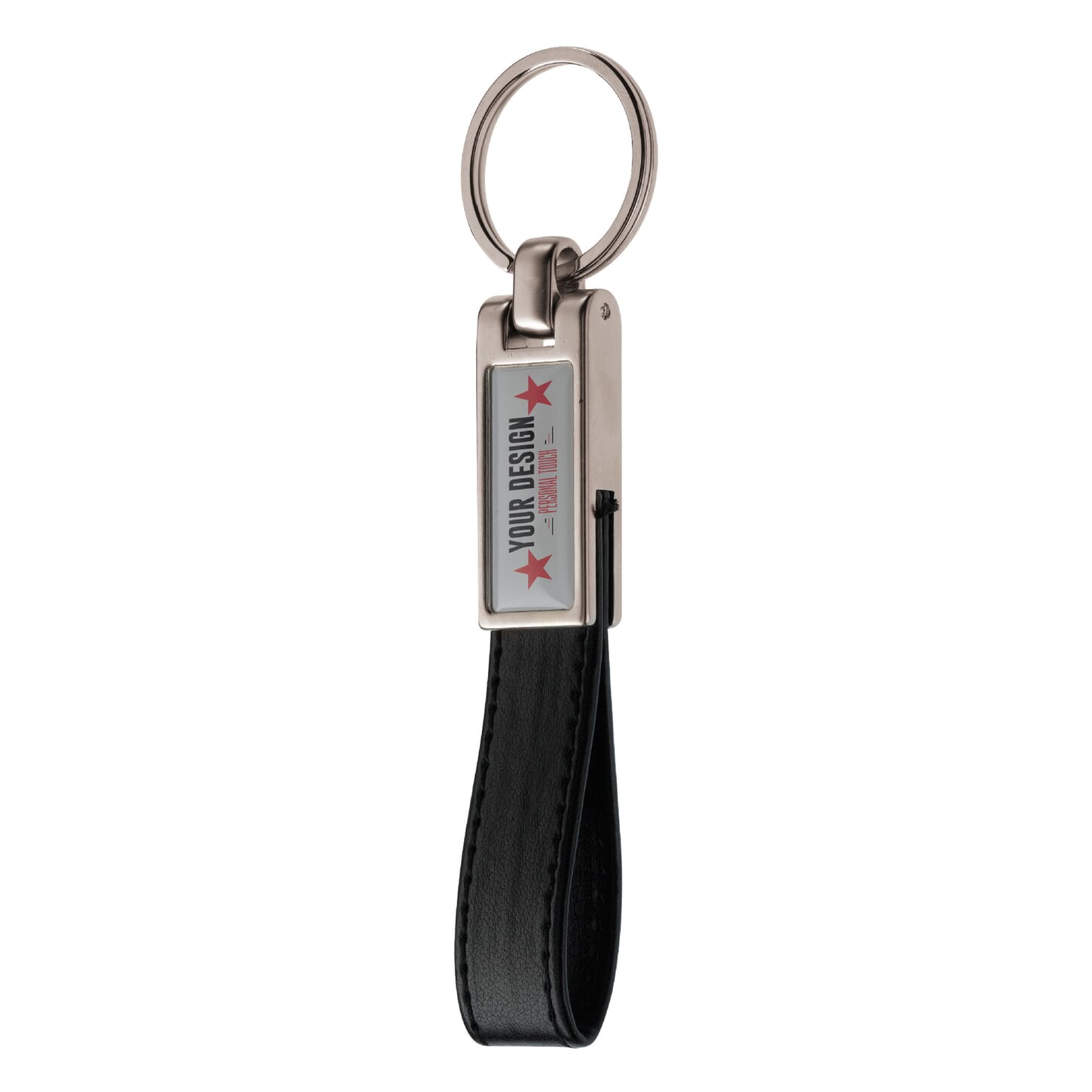 Metallschlüsselanhänger mit Lederband und rechteckigem Doming.