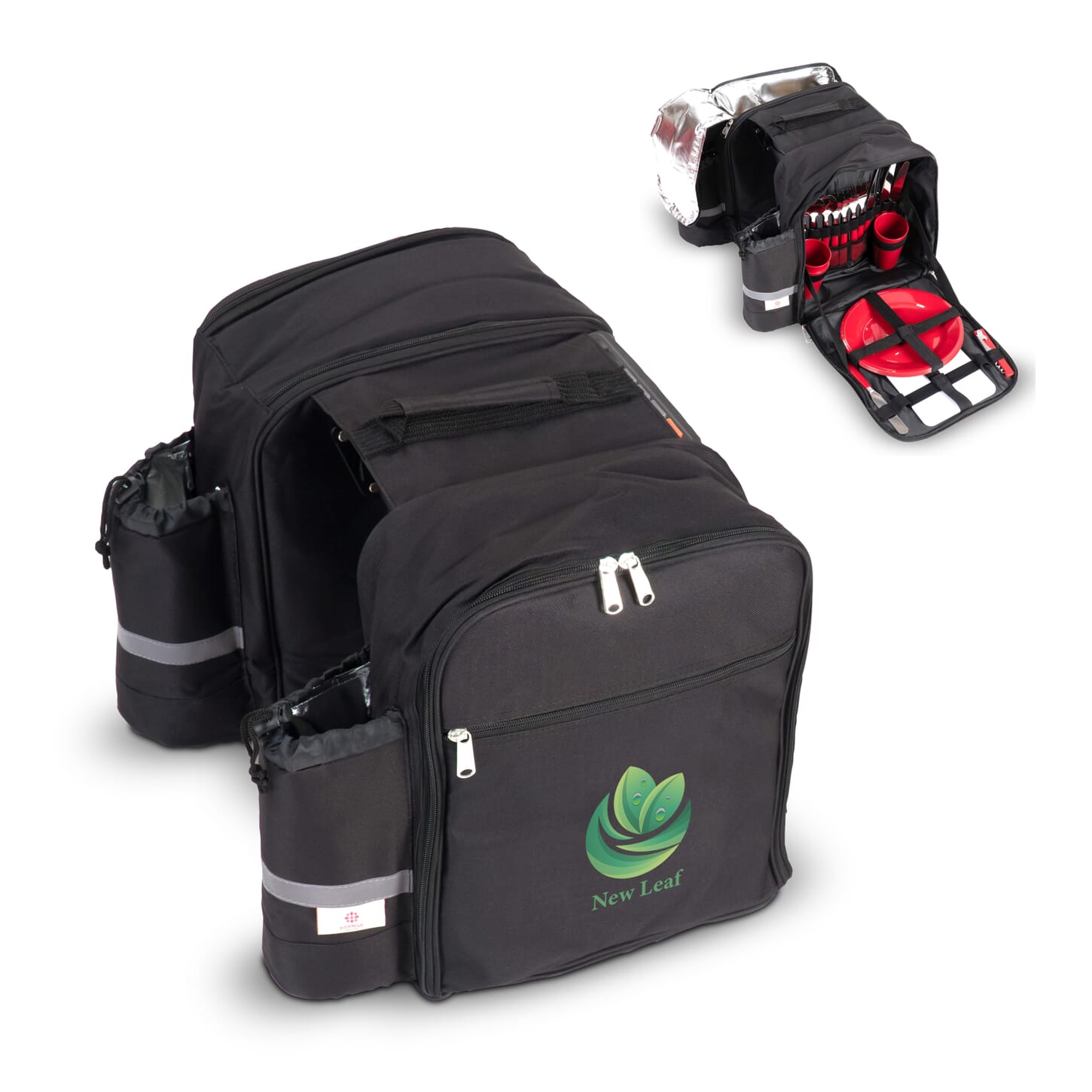 Geräumige Doppel-Picknick-Fahrradtasche mit umfangreichem Essgeschirr auf der einen Seite. Das Fach auf der anderen Seite ist mit Isoliermaterial gepolstert. Die isolierten Flaschenhalter haben reflektierende Streifen für zusätzliche Sicherheit. Dank der Universalhaken kann diese Tasche an vielen Arten von Gepäckträgern, einschließlich E-Bikes, befestigt werden.